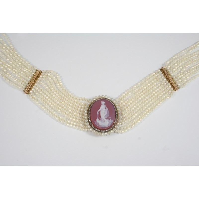 centred with an oval carved shell cameo depicting a classical woman, within a surround of rose-cut diamonds and an outer border of untested pearls, mounted on ten rows of untested pearls, with gold and rose-cut diamond dividers and clasp, 39cm. long.