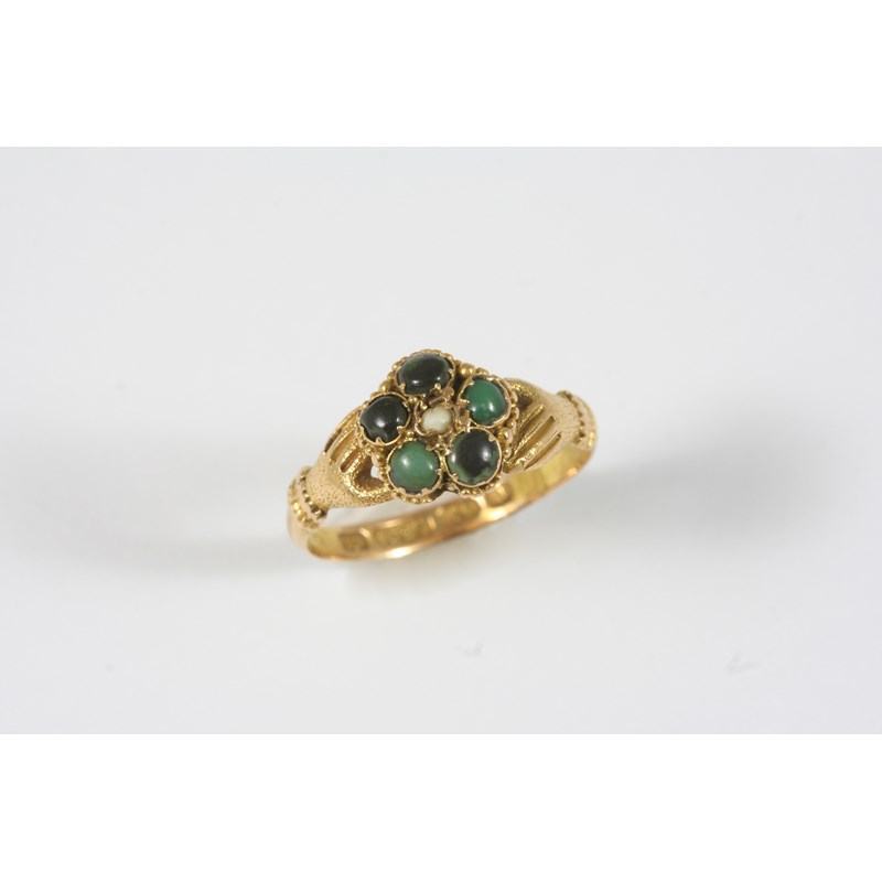A VICTORIAN TURQUOISE RING the 15ct. gold ring is formed as two hands holding a turquoise set cluster. Size K.