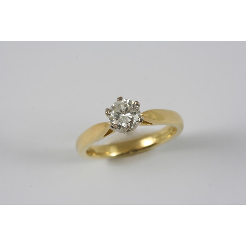 A DIAMOND SOLITAIRE RING the brilliant-cut diamond weighs approximately 0.65 carats and is set in 18ct. gold. Size N 1/2.