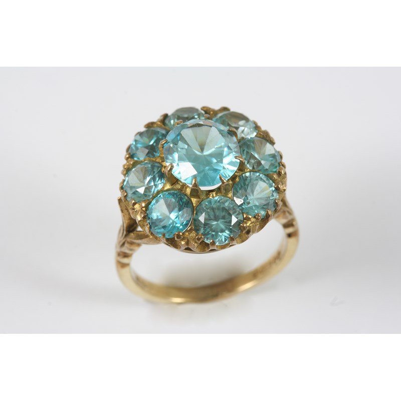 A ZIRCON AND GOLD CLUSTER RING centred with an oval-shaped zircon within a surround of eight circular-cut zircons, in gold. Size P.