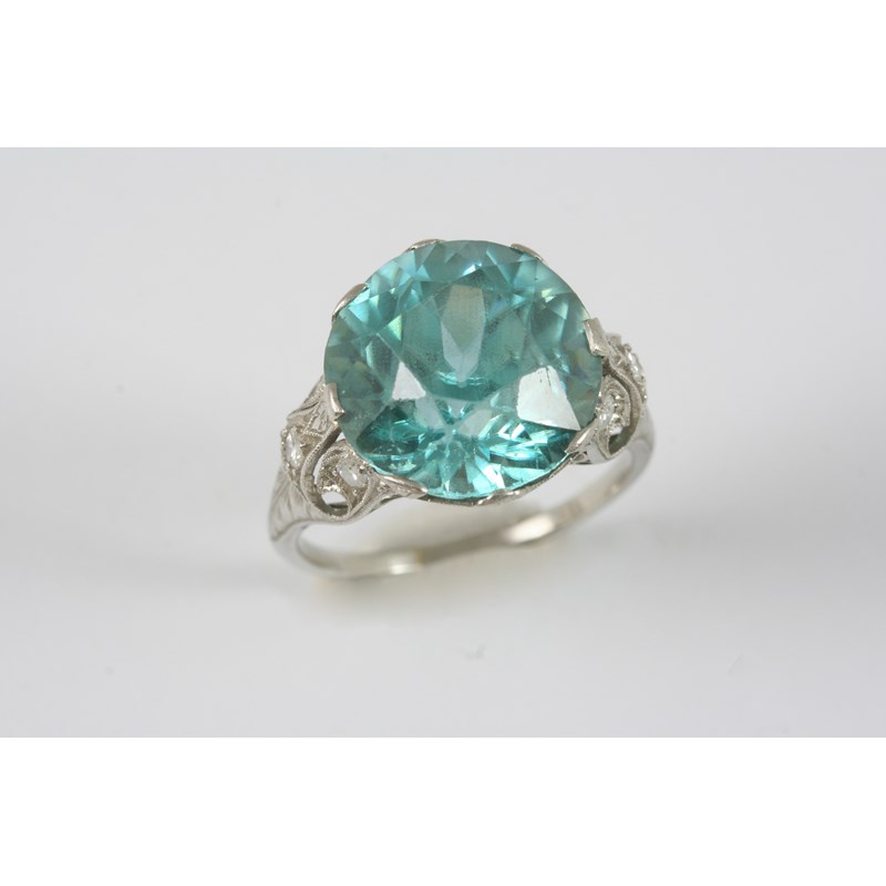 A ZIRCON AND DIAMOND RING mounted with a large circular-cut zircon, with circular diamonds to the openwork shoulders. Size P 1/2.