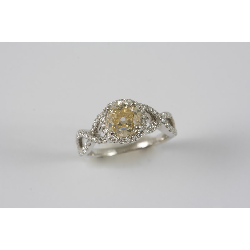 A FANCY COLOURED DIAMOND SOLITAIRE RING the fancy yellowish brown circular diamond is set within a surround of circular-cut diamonds, with further circular-cut diamonds set to the shoulders, in 18ct. white gold. Size K.