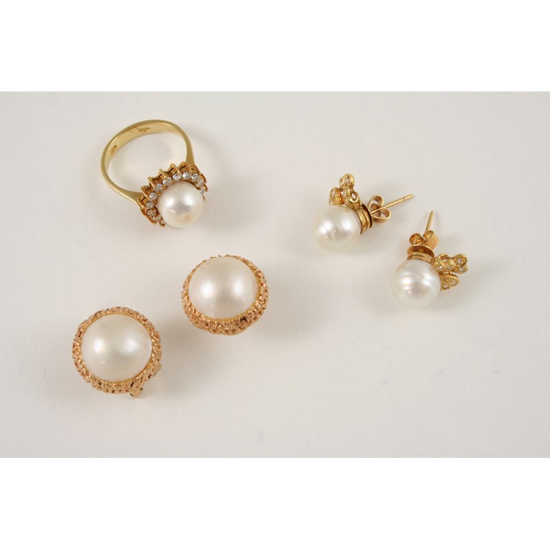 together with a pair of cultured pearl and diamond stud earrings, and a cultured pearl and diamond cluster ring, set in 18ct. gold. Size M 1/2.