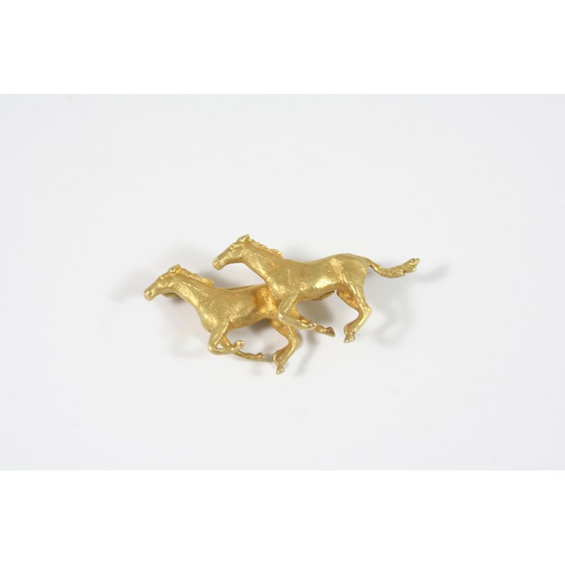 A 9CT. GOLD HORSE BROOCH formed as two horses galloping side by side, 5.5cm. wide, 18.6 grams.