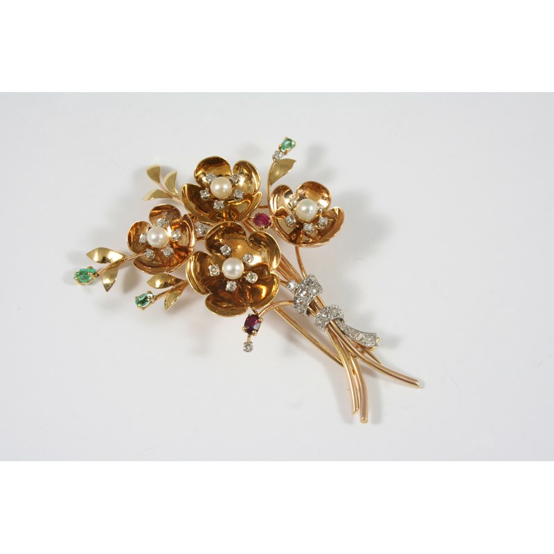A FRENCH GOLD AND GEM SET BROOCH designed as a bunch of flowers and set overall with circular-cut diamonds and with rubies, emeralds and untested pearls, in 18ct. gold. With French marks, 8cm. long.