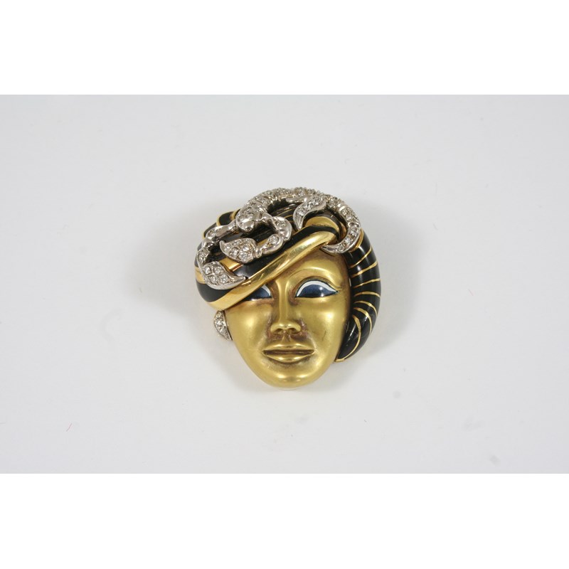 A DIAMOND AND GOLD PENDANT designed as the head of a woman wearing a headdress mounted with a diamond set lobster, with pierced locket compartment to the reverse, 4 x 3.5cm.