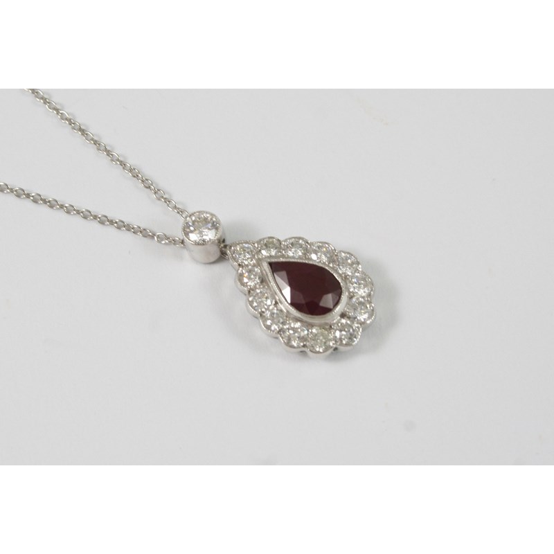 the pear-shaped ruby is set within a surround of circular-cut diamonds, on an 18ct. white gold fine link chain, the pendant 2.3cm. long.