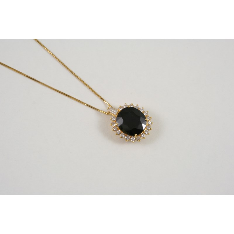 the oval-shaped sapphire is set within a surround of circular-cut diamonds, with a baguette-cut diamond set to the pendant loop, in 18ct. gold, on a fine link 18ct. gold chain, 1.75cm. wide.