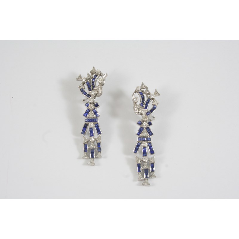 A PAIR OF SAPPHIRE AND DIAMOND DROP EARRINGS each set overall with calibre-cut sapphires and circular-cut and triangular-shaped diamonds, 5.5cm. long.