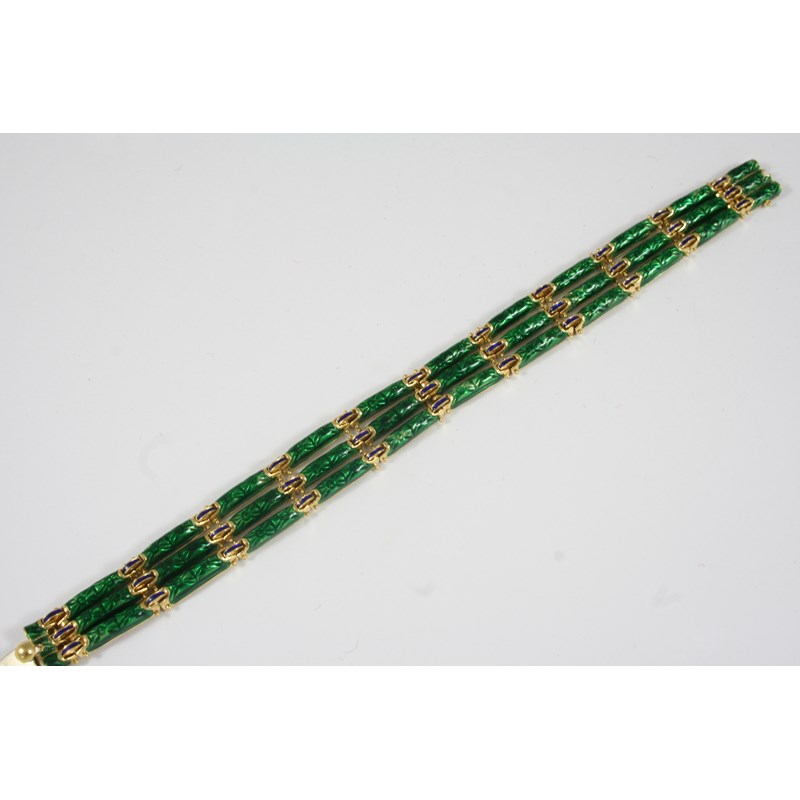the triple row bracelet is formed with green long and blue short enamel links, in gold, with concealed clasp, 18.5cm. long.
