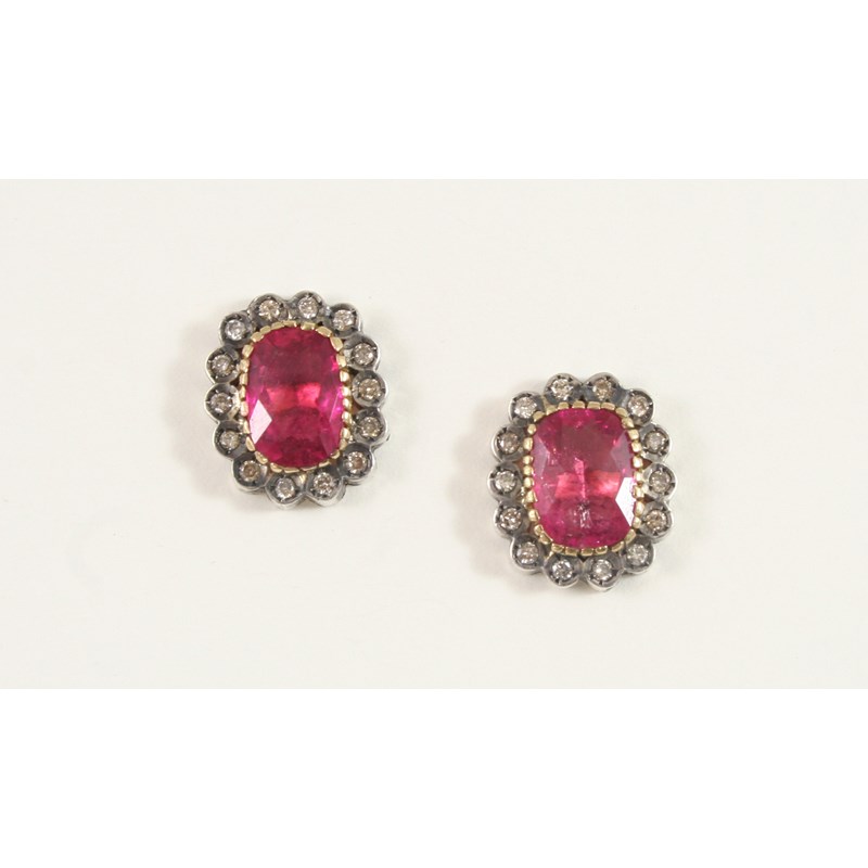 each earring set with an oval-shaped pink tourmaline within a surround of circular-cut diamonds.