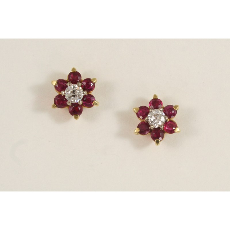 A PAIR OF RUBY AND DIAMOND STUD EARRINGS of flowerhead form, each centred with a circular-cut diamonds within a surround of six circular-cut rubies.
