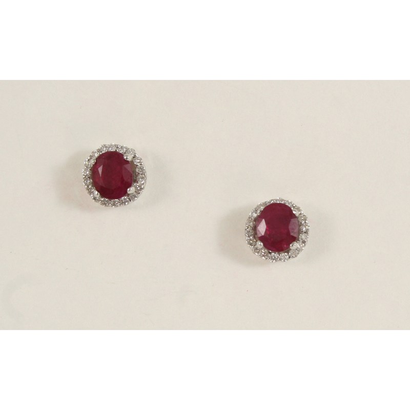 A PAIR OF RUBY AND DIAMOND CLUSTER STUD EARRINGS each earring set with an oval-shaped ruby within a surround of circular-cut diamonds, in 18ct. white gold.
