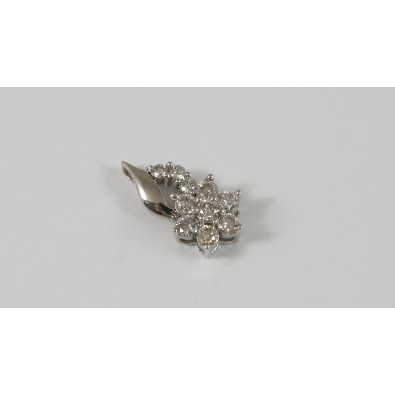 A DIAMOND PENDANT of foliate form, set with circular-cut diamonds in 18ct. white gold, 2cm. long.
