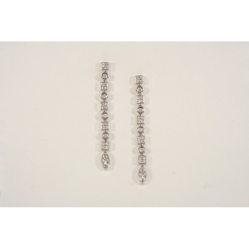 each formed with collet set circular diamonds alternately set with square sections of four circular diamonds, with marquise set diamond drop, 6.5cm. long.