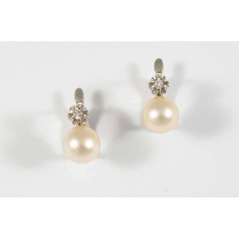 A PAIR OF CULTURED PEARLS AND DIAMOND EARRINGS each earring set with a cultured pearl suspended from a single diamond surmount, in 18ct. white gold, 1.75cm. long.