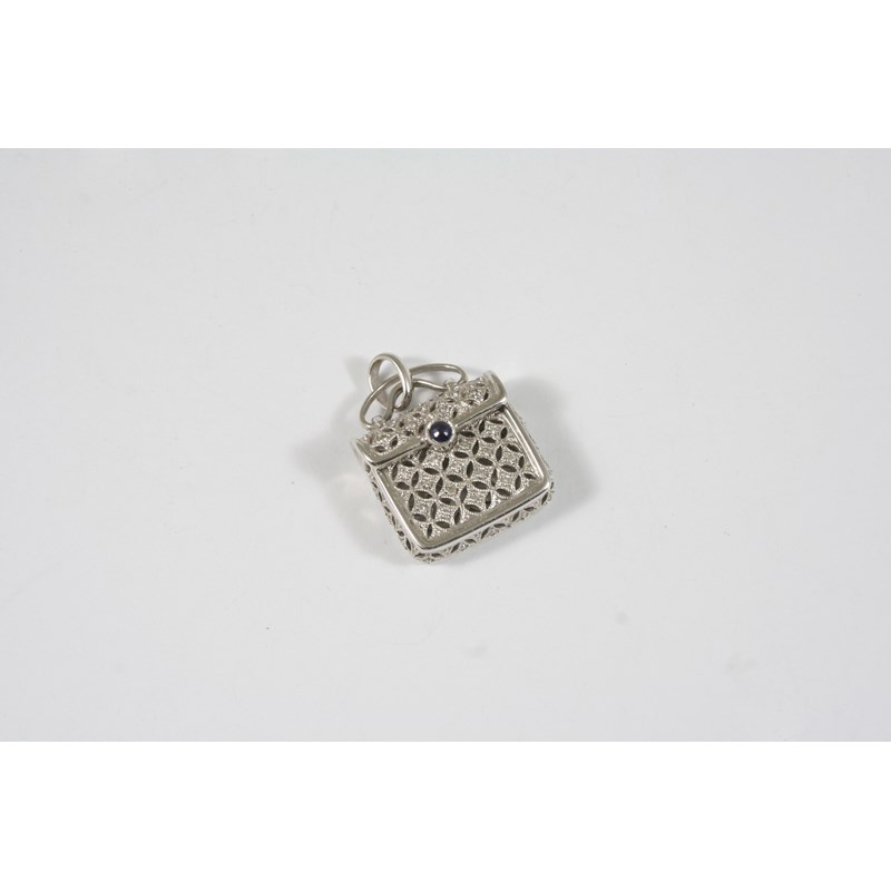 A DIAMOND AND GOLD PENDANT in the form of a bag, the openwork design is set overall with circular-cut diamonds, with a circular sapphire set to the clasp, in 18ct. white gold, 2cm. wide, 10.5 grams.