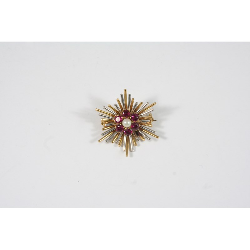 A RUBY AND GOLD BROOCH the 9ct. gold flowerhead is centred with circular-cut rubies and a small pearl, 3cm. wide.