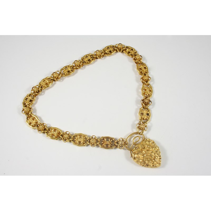 the linked floral panels suspend an ornate repousse work heart-shaped padlock pendant with locket compartment to the reverse, 40cm. long, 44 grams.
