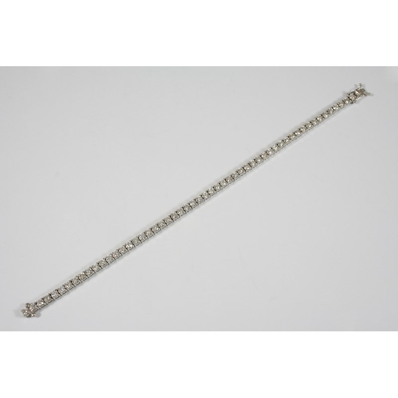 A DIAMOND LINE BRACELET set with fifty four circular-cut diamonds in 18ct. white gold, 19cm. long.