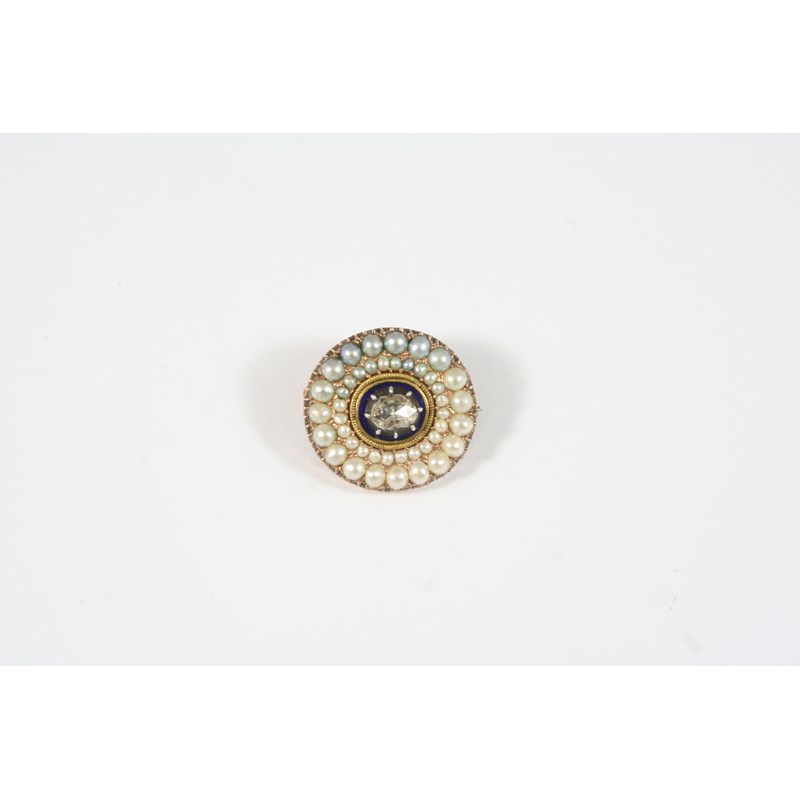 the blue enamel centre is mounted with an oval rose-cut diamond within a double border of graduated half pearls, in gold, 2.5cm. wide.