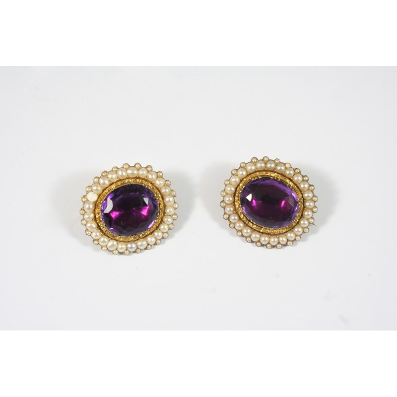 A PAIR OF WILLIAM IV AMETHYST AND PEARL SET BROOCHES