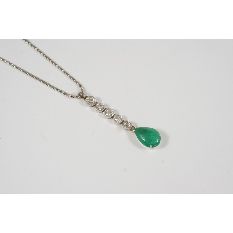 the pear-shaped cabochon emerald drop is suspended from a line of graduated circular-cut diamonds, on an 18ct. white gold neckchain, the pendant 4.5cm. long.