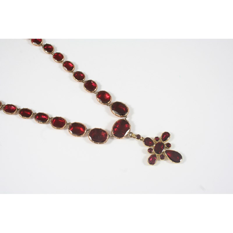 the necklace formed with graduated oval-shaped garnets in gold closed back settings, suspends a detachable foliate pendant drop set with pear, oval and circular-shaped garnets, also in gold closed back settings, 42cm. long.