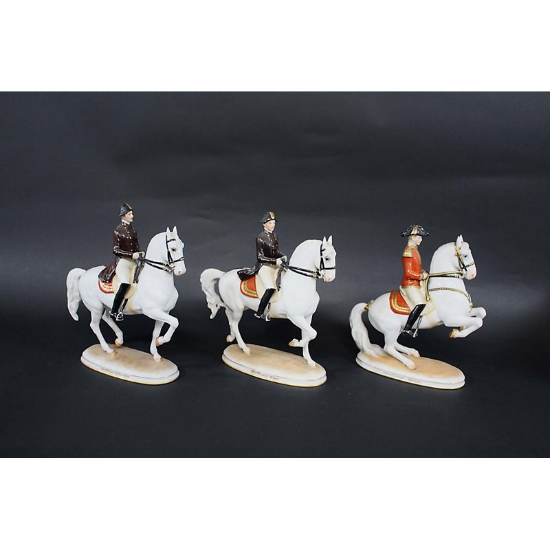 3 porcelain Spanish Riding School Equestrian figures, each on oval shaped bases. Each figure with a name around the base in gold lettering. Each marked, Augarten, Vienna Mark, Wien, and numbers 1591, 1590, and 1592. Tallest 9 1/2ins (24cms) high. (3)