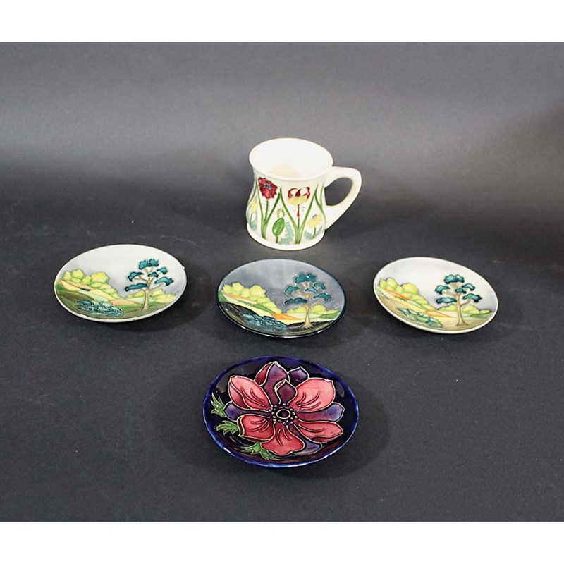 3 small modern Moorcroft dishes in the After the Storm design (believed to be one of the last designs by Walter Moorcroft), all trial pieces and made in 1996. Also with a Moorcroft Centenary tankard (1997), and a small Anemone dish (boxed). 3 dishes 4 3/4ins (12cms) diameter. (5)