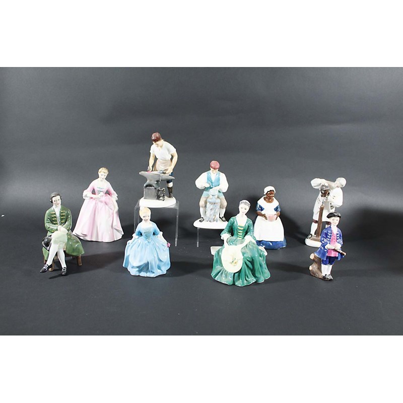 a set of 9 figures, HN 2240 Blacksmith, HN2239 Wigmaker, HN2183 Boy, HN2228 A Lady, 2233 Royal Governors Cook, HN2154 A Child, HN2208 Silversmith, HN2209 A Hostess, HN2227 A Gentleman. (9)
