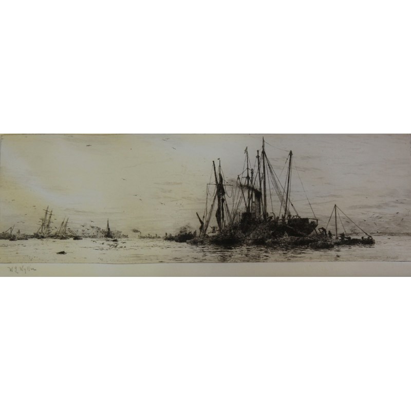 WILLIAM LIONEL WYLLIE, RA (1851-1931) UNLOADING CARGO ON THE THAMES AT PURFLEET Etching, signed 10.5 x 32.5cm.