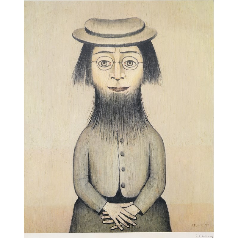 * On a journey from Cardiff to Paddington in 1957, Lowry saw this woman join the train at Newport and later recalled, "She had a very nice face and quite a long beard. Well sir, I just couldn't let such an opportunity pass, so I began almost at once to make a little drawing of her on a piece of paper. She was sitting right opposite me. After a while, she asked, rather nervously, what I was doing. I blushed like a Dublin Bay prawn and showed her my sketch - the one from which I later made my painting of her." With compassion and a sense of empathy, Lowry commented that she was "an able and intelligent woman, completely alone and isolated behind her deformity."