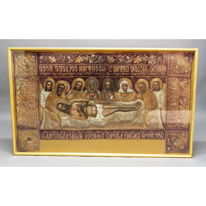 RUSSIAN PAINTED AND EMBROIDERED ICON,