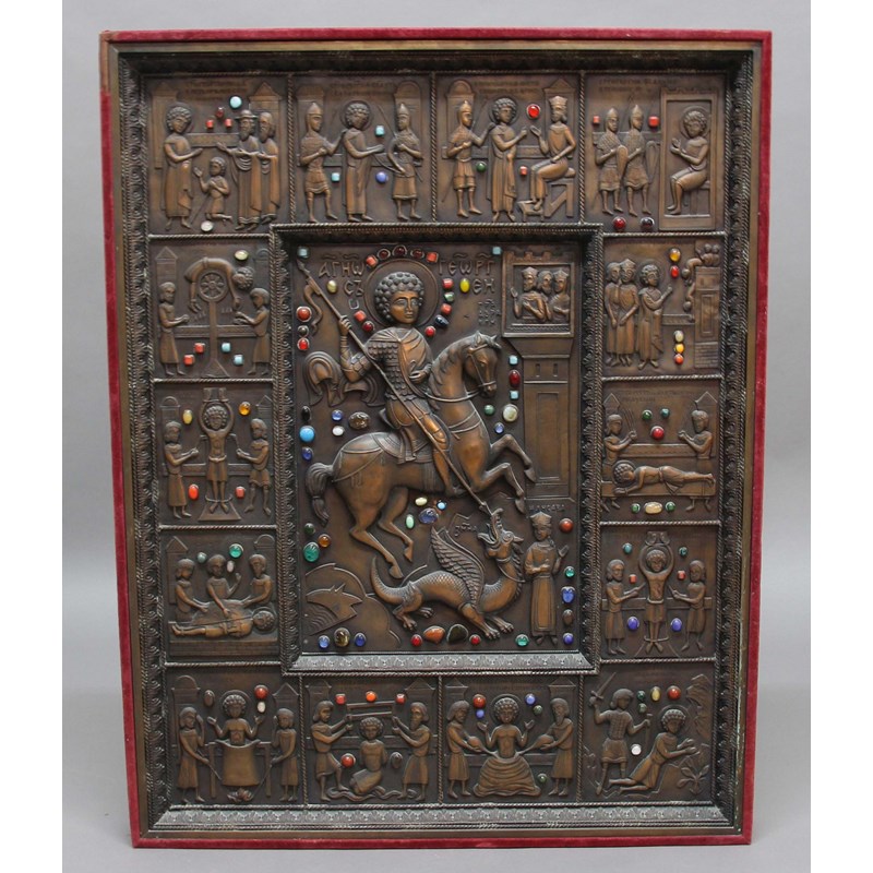 a large copper relief panel, Russian or Eastern European, the central depiction of St George slaying the dragon surrounded by fourteen panels depicting his torture and persecution, inset with gemstone cabuchons, height 100cm, width 78cm