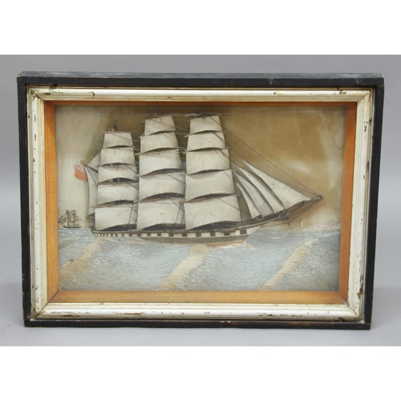 19th century, the three masted ship with wooden masts, full set of canvas sails and cotton rigging on a woolwork sea with rolling waves, a lighthouse on a headland and a man 'o war in the background, mounted in a box frame, 43cm x 62cm