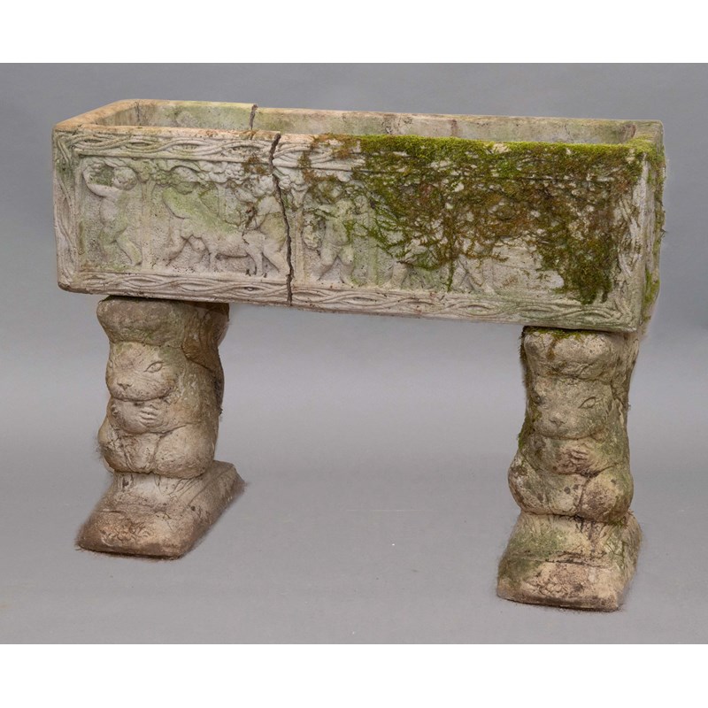 RECONSTITUTED STONE RECTANGULAR TROUGH, cast in relief with cherubs at plate, on squirrel plinth, height 72cm, width 80cm, depth 25cm