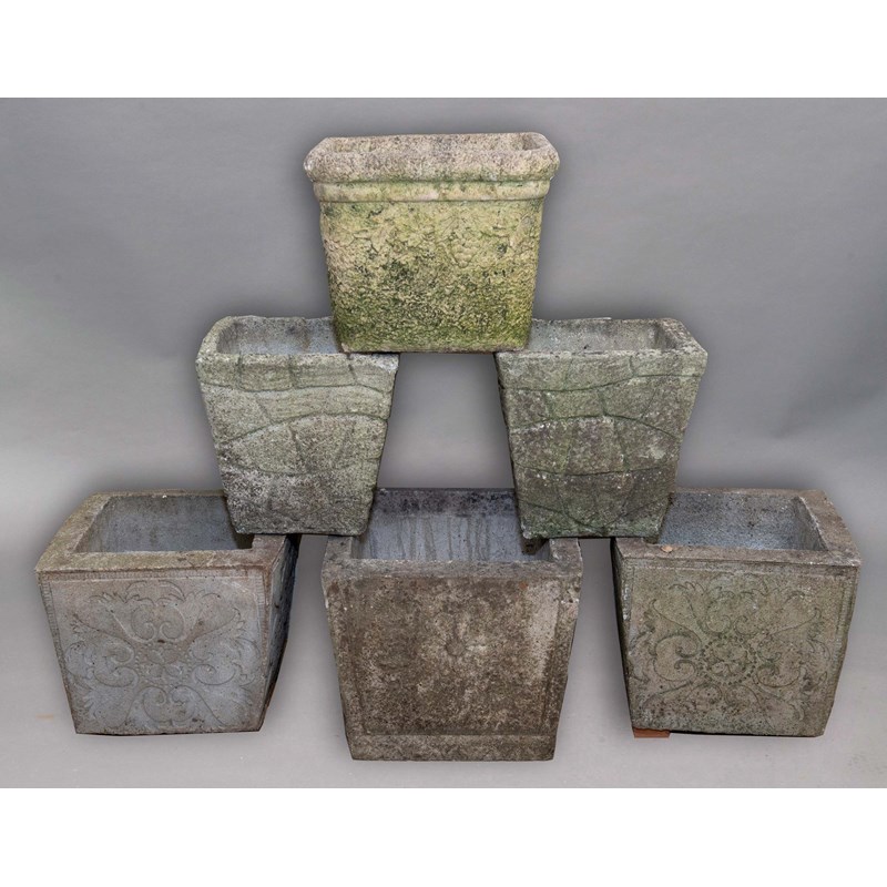 COLLECTION OF SIX VARIOUS PLANTERS, reconstituted stone, all of tapering square section, each approximately 29cm tall (6)