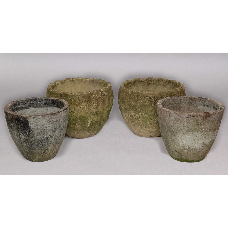 TWO PAIRS OF CIRCULAR RECONSTITUTED STONE PLANTERS, one with floral decoration in relief, heights 30cm and 28cm (4)