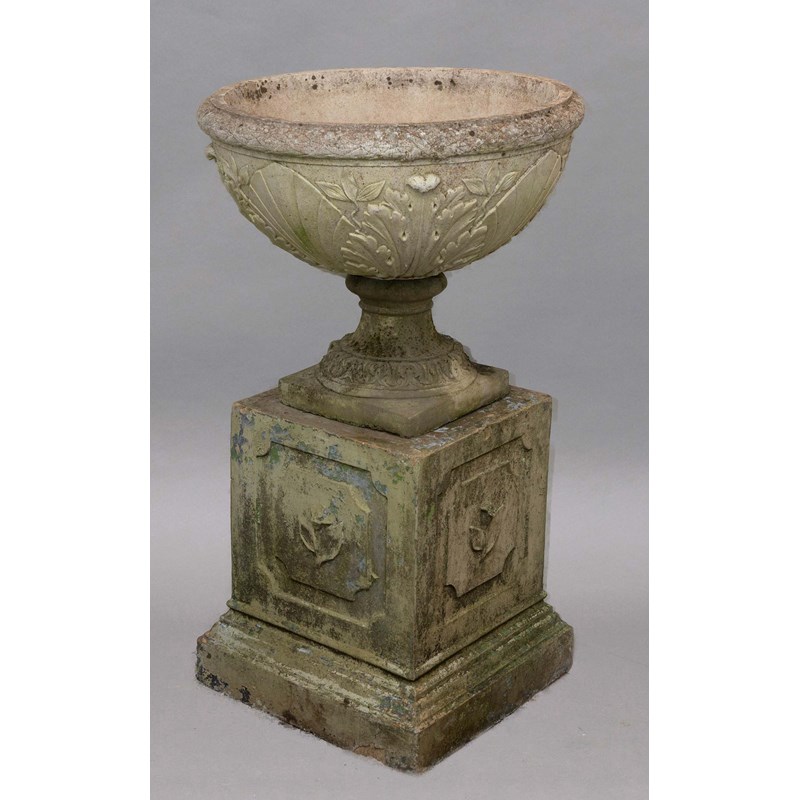VICTORIAN SQUARE SECTION STONEWARE PLINTH, with floral plaques, height 58cm; together with a later hemishperical bowl with stiff leaf decoration on a socle base, height 56cm (2)