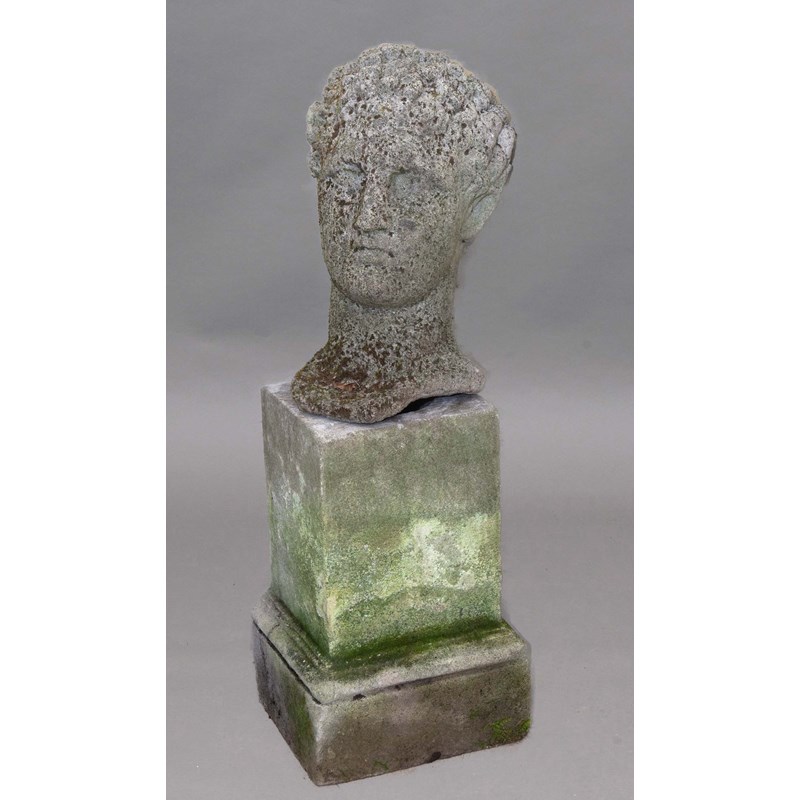 RECONSTITUTED STONE BUST OF DAVID, on a square section, stepped plinth, total height 82cm