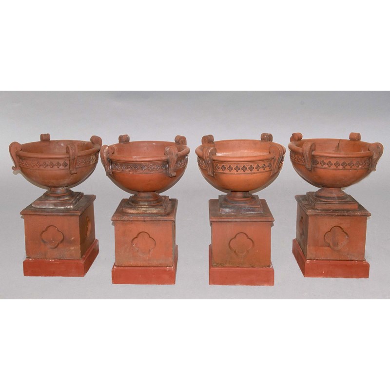 SET OF FOUR VICTORIAN TERRACOTTA URNS, with scrolling handles, square section plinths and replacement bases, height 97cm (4)