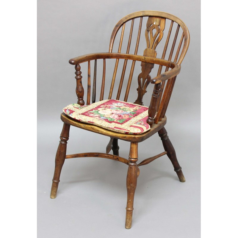 YEW AND ELM WINDSOR CHAIR, 19th century, the pierced splat above an elm seat, turned supports and crinoline stretcher, height 87cm, width 50cm, depth 39cm
