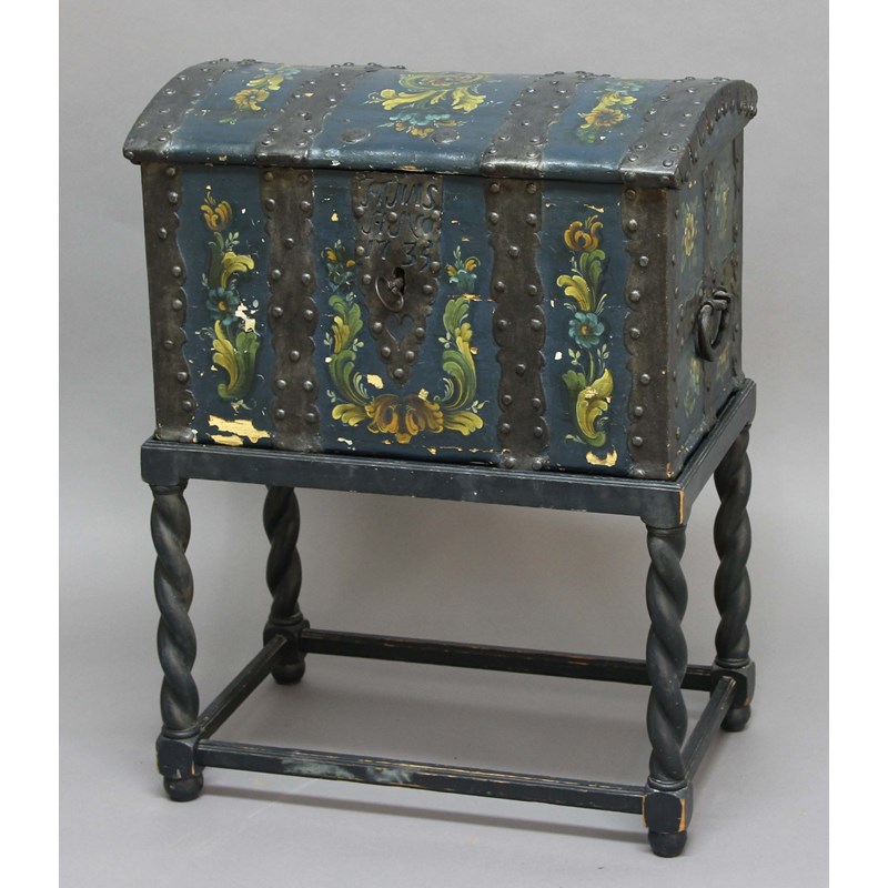18th century, the domed cover enclosing a candle box interior, the iron strapwork interspersed with floral painting and dated 1735, inscribed verso Rest 1931/ KK on a later stand, trunk dimensions height 41cm, width 63cm, depth 40cm
