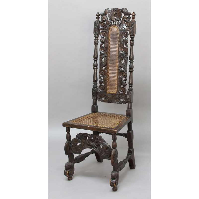 CHARLES II STYLE OAK HALL CHAIR, the top rail centred on a peacock above a caned splat and seat, arching front rail carved with a bird and scrolling front legs, height 132cm