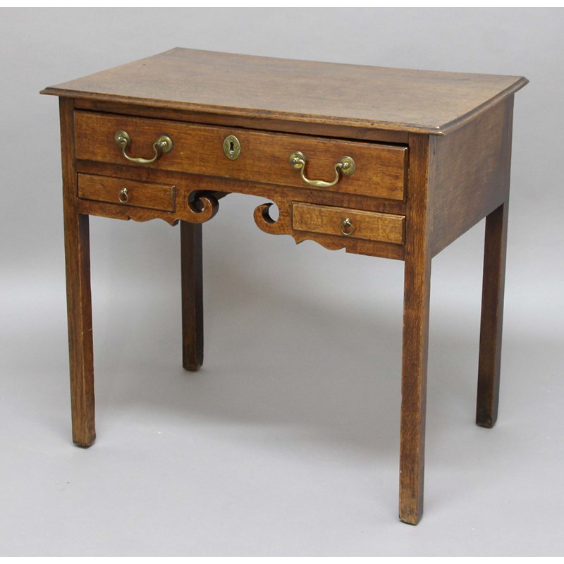 OAK HALL TABLE, 18th century, the rectangular top above three drawers on square section legs, height 77cm, width 83cm, depth 52cm