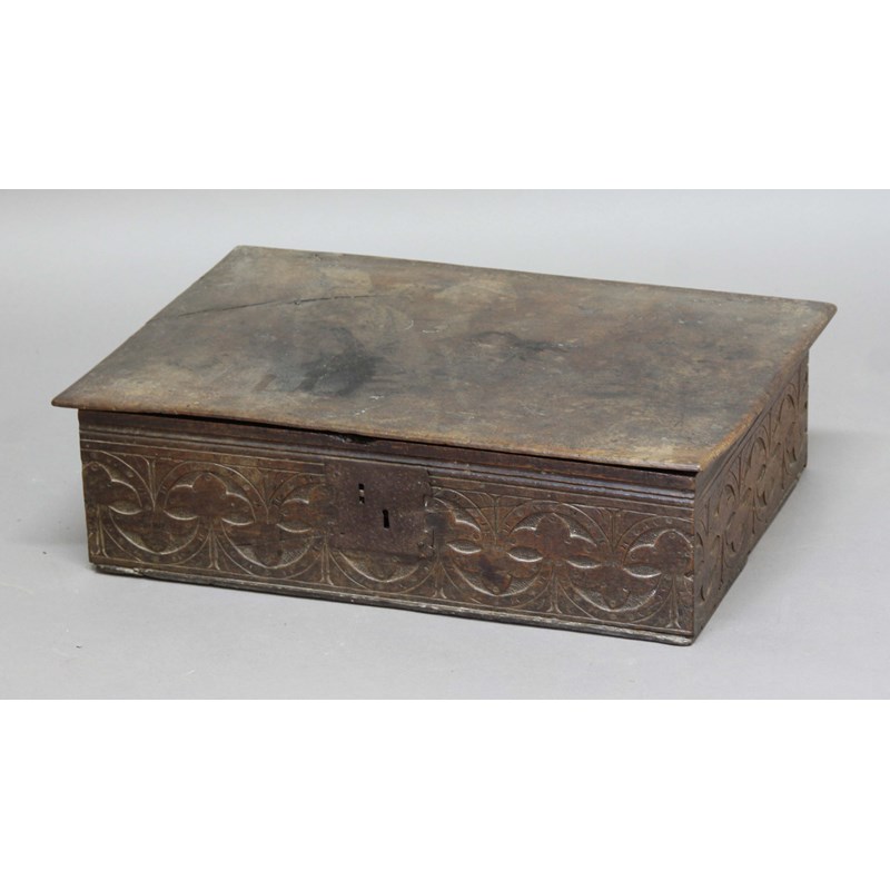 OAK BIBLE BOX, 17th century, with stylised foliate carving to the sides, height 18cm, width 63cm, depth 43cm