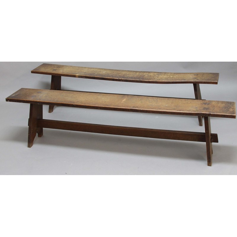 Cotswold School, the cleated, three plank top on waisted end supports tied by a stretcher, the benches of similar construction, table height 76cm, width 182cm, depth 73cm (3)
