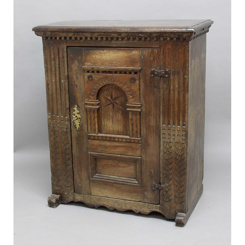 GERMAN OAK AND INLAID CUPBOARD, probably 17th century, the single door with an arched panel centred on am inlaid star flanked by fluted panels, height 114cm, width 97cm, depth 49cm