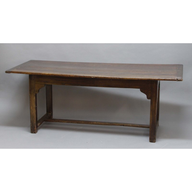 essentially 18th century, the cleated, planked top on a base with rounded square legs and H stretcher, height 76cm, width 196cm, depth 83cm